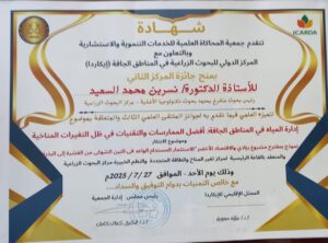 حصولها على جائزة الابتكار 2025 عن مشروع ريادي لإدارة الموارد المائية في المناطق الجافة لمواجهة تحديات التغيرات المناخية.