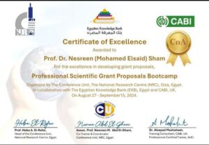 فوزها بـ التميز العلمي الذهبي 2024 عن تطوير مقترحات المشاريع البحثية أمام المركز القومي للبحوث وبنك المعرفة المصري.