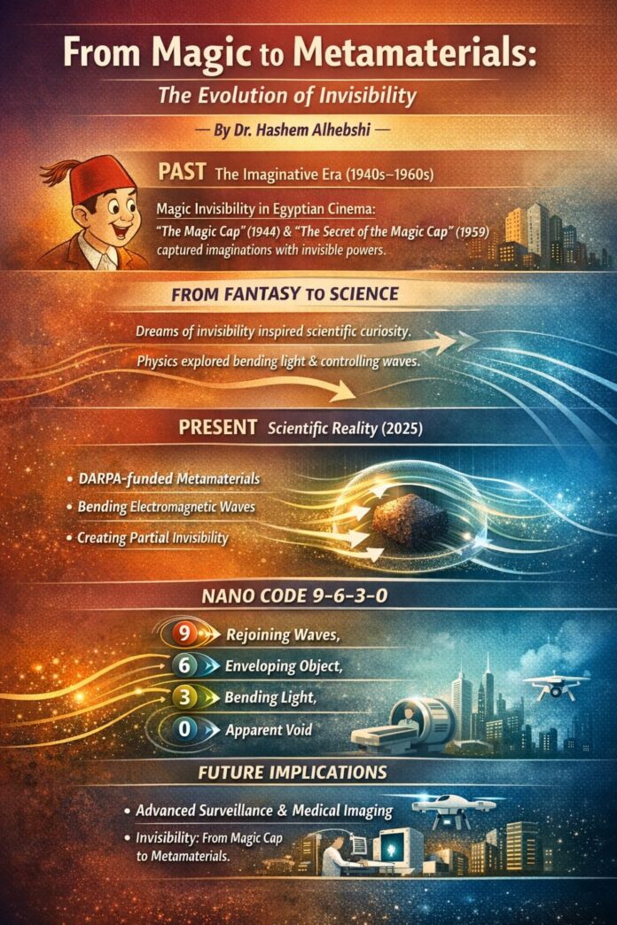 لطالما كان حلم الاختفاء حبيس الخيال والأساطير، وتجسد في الثقافة الشعبية العربية عبر طاقية الإخفاء التي اشتهرت في أفلام الفنان إسماعيل ياسين. ما كان مجرد خيال كوميدي أصبح اليوم موضوعًا بحثيًا جادًا في عالم المواد الفوقية (Metamaterials)، التي تُصمم هندسيًا للتحكم في مسار الضوء وحني الموجات الكهرومغناطيسية حول الأجسام، بهدف خلق وهم بصري للفراغ والاختفاء.